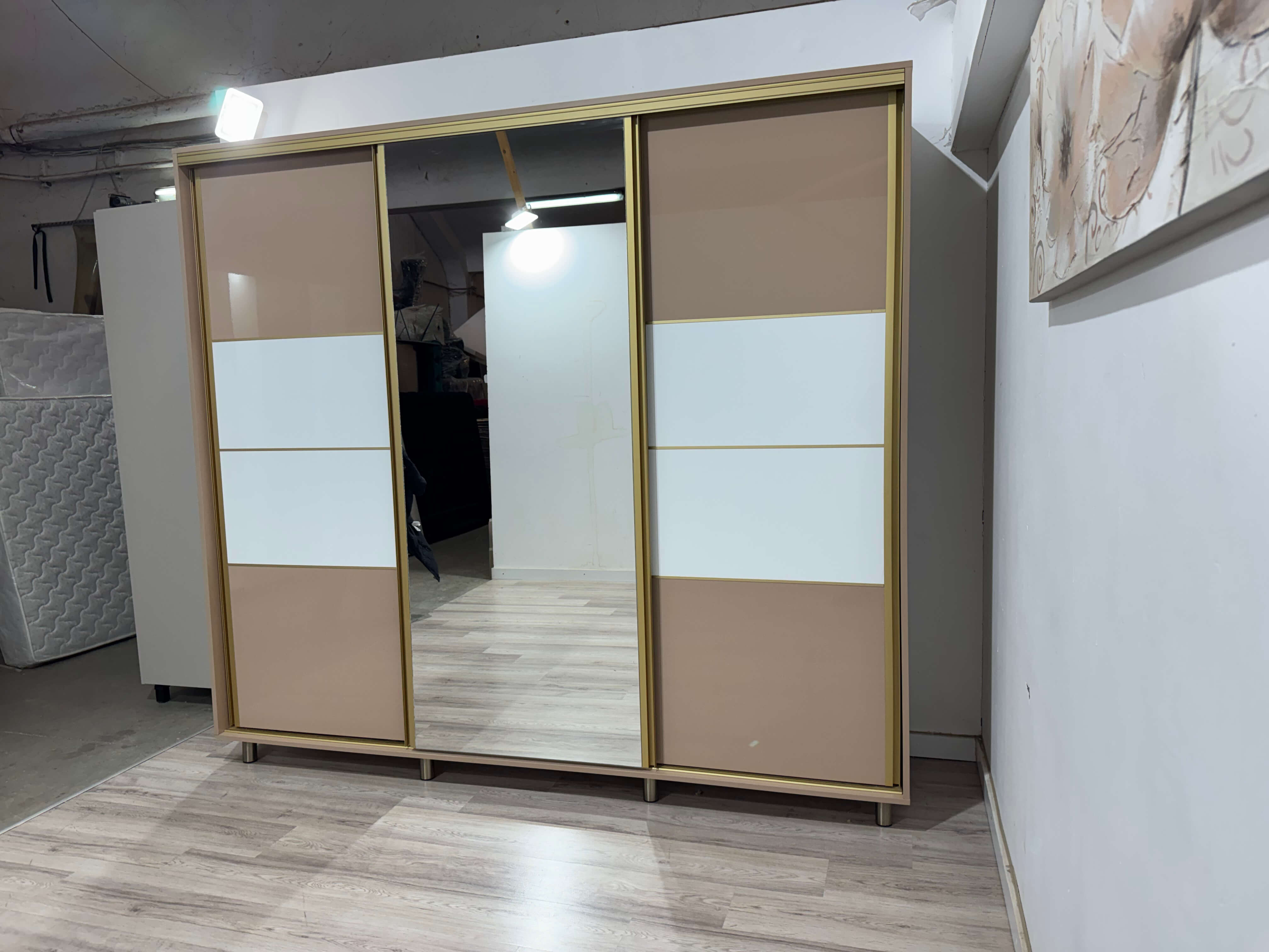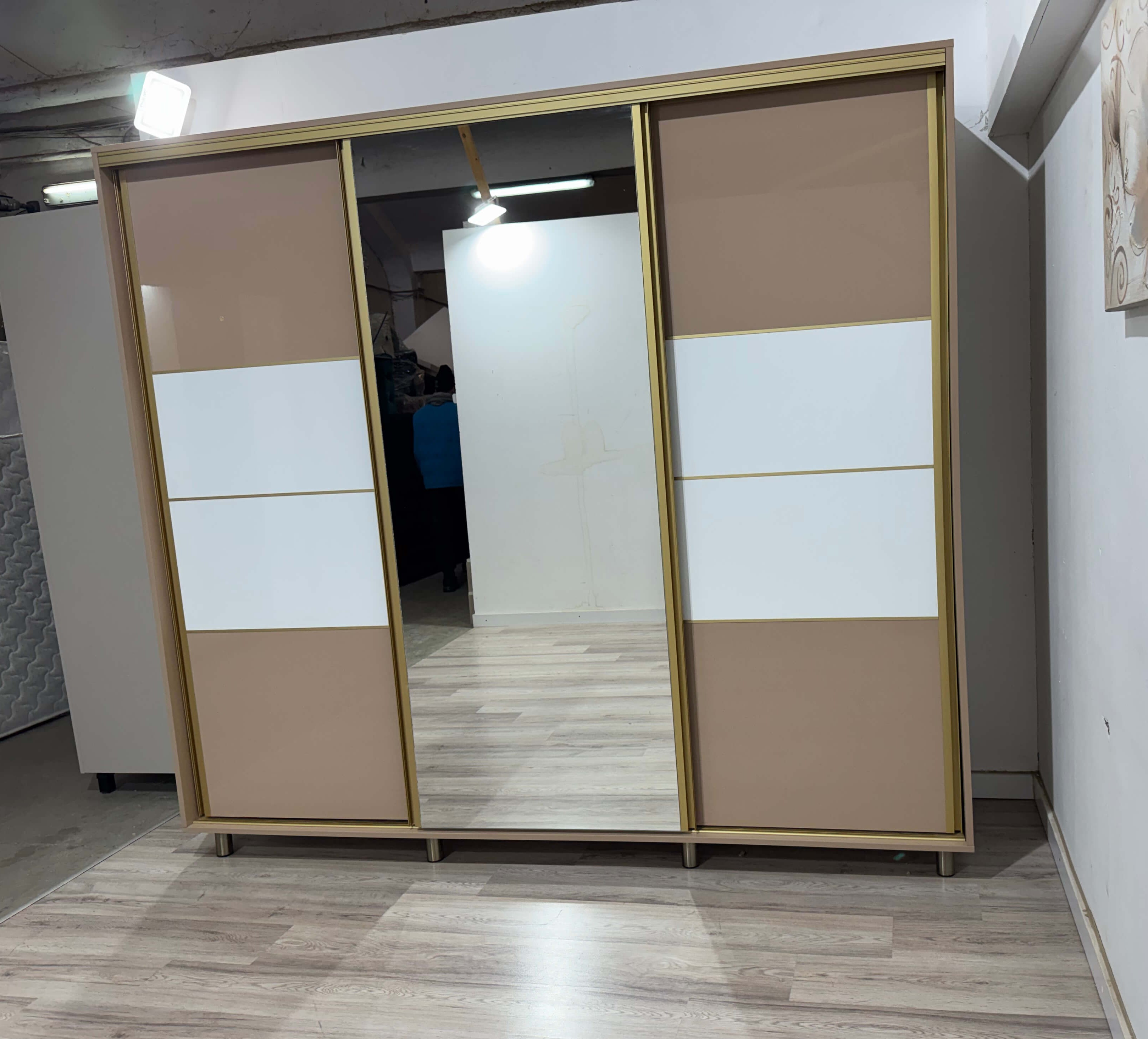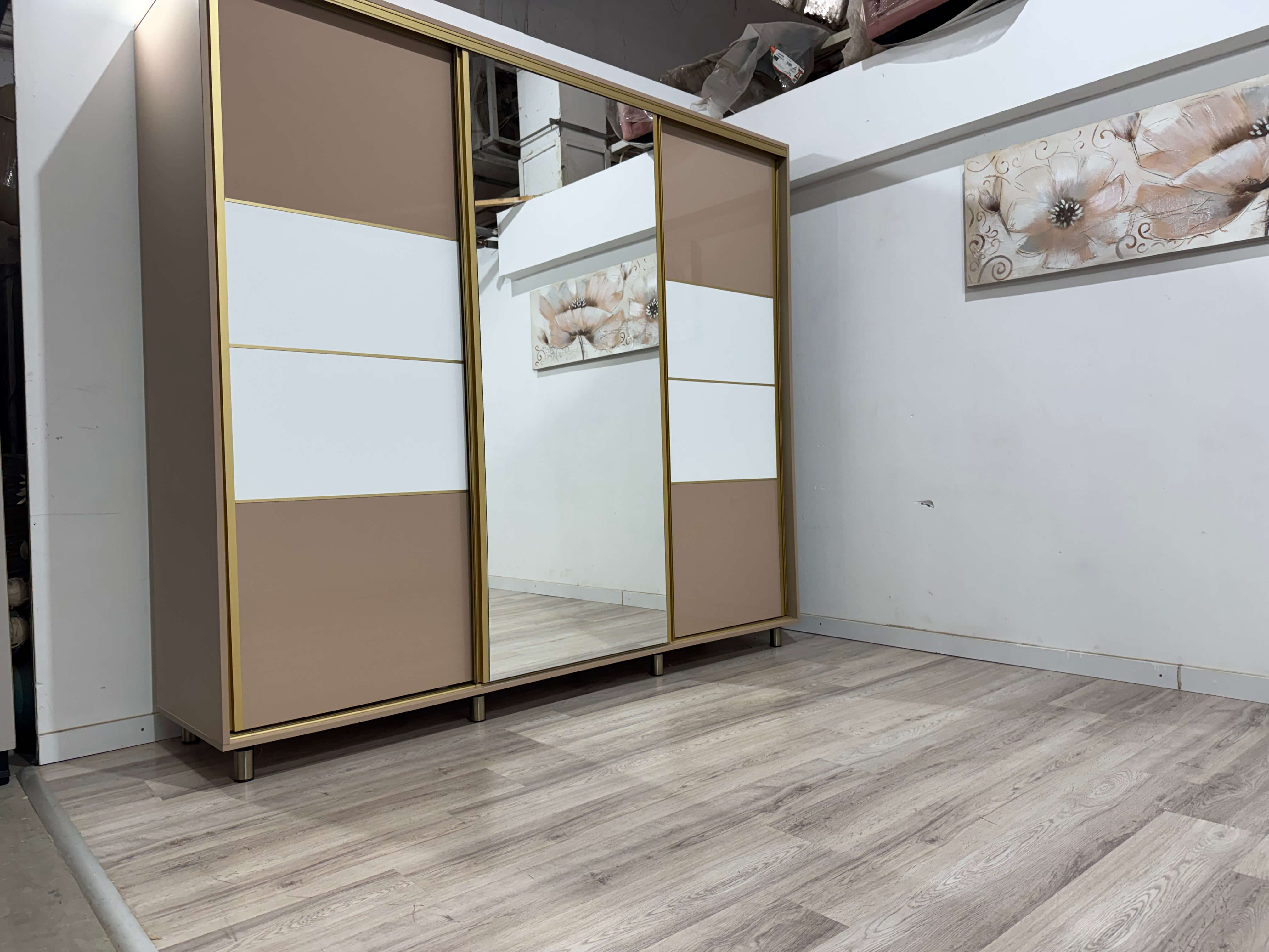 Dressing din MDF lucios cu 3 uși glisante, oglindă mare și inserții aurii – model AXIS