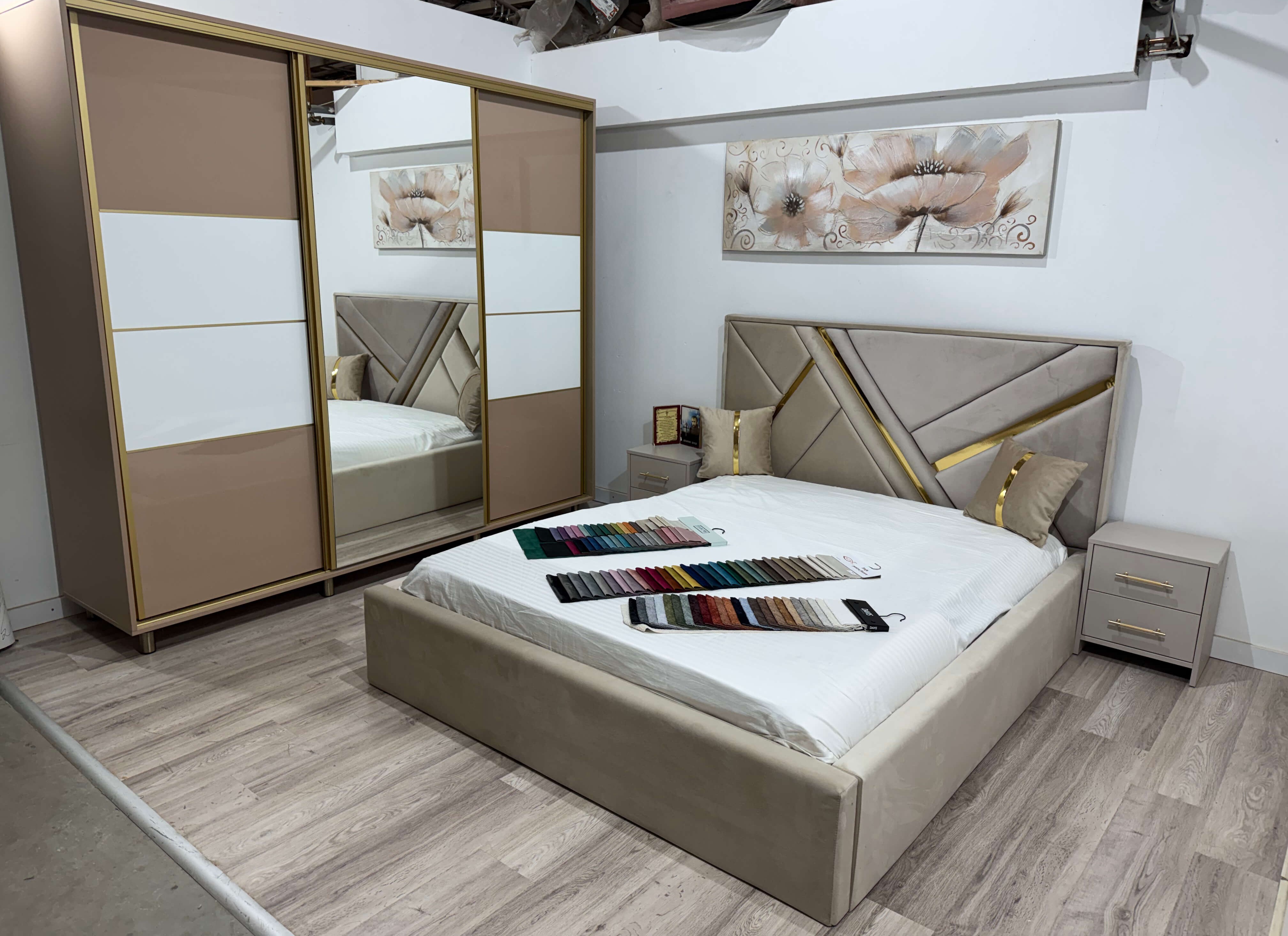 Dormitor complet cu pat tapitat catifea, dressing cu uși MDF lucios și noptiere – model AXIS
