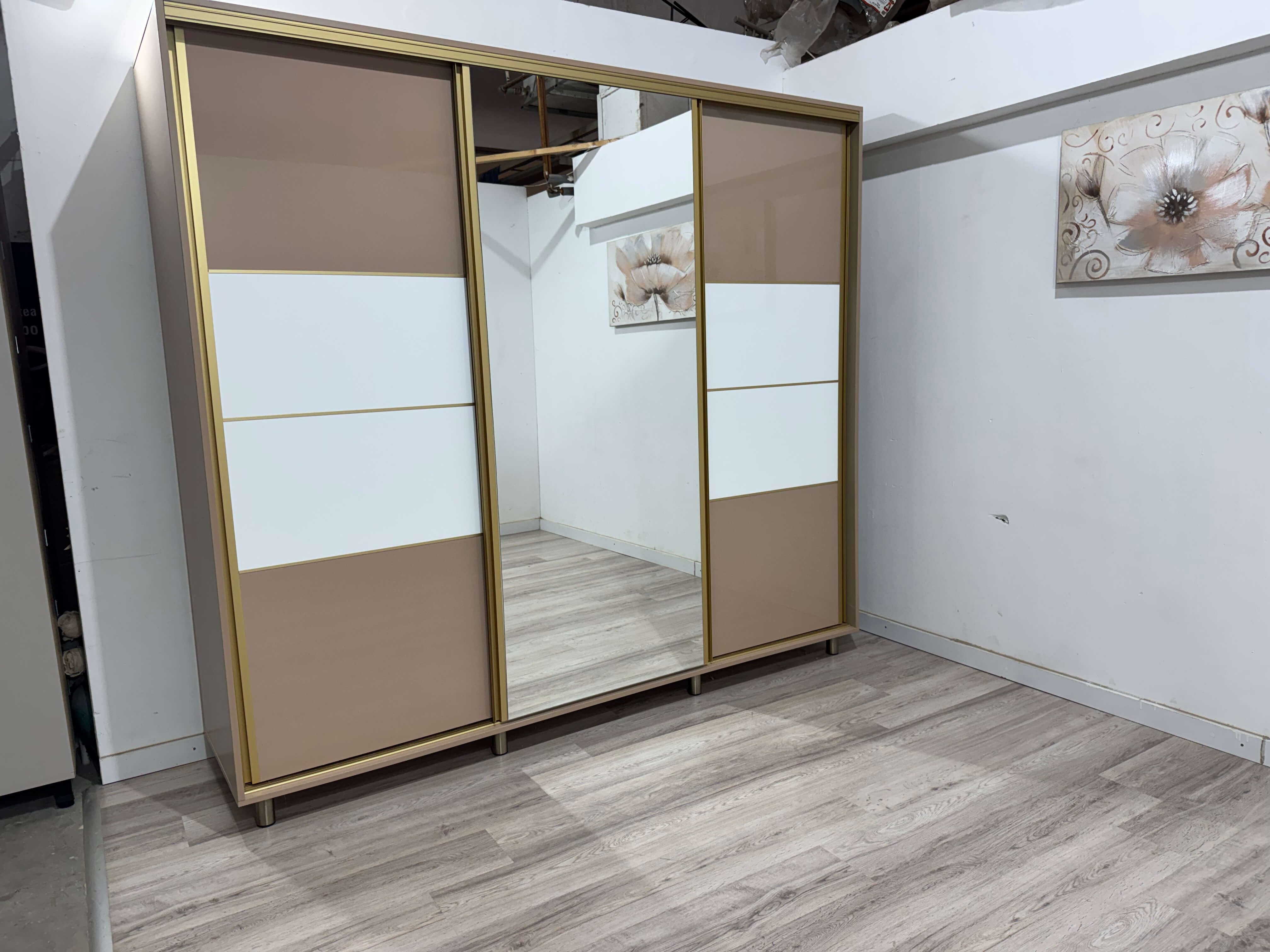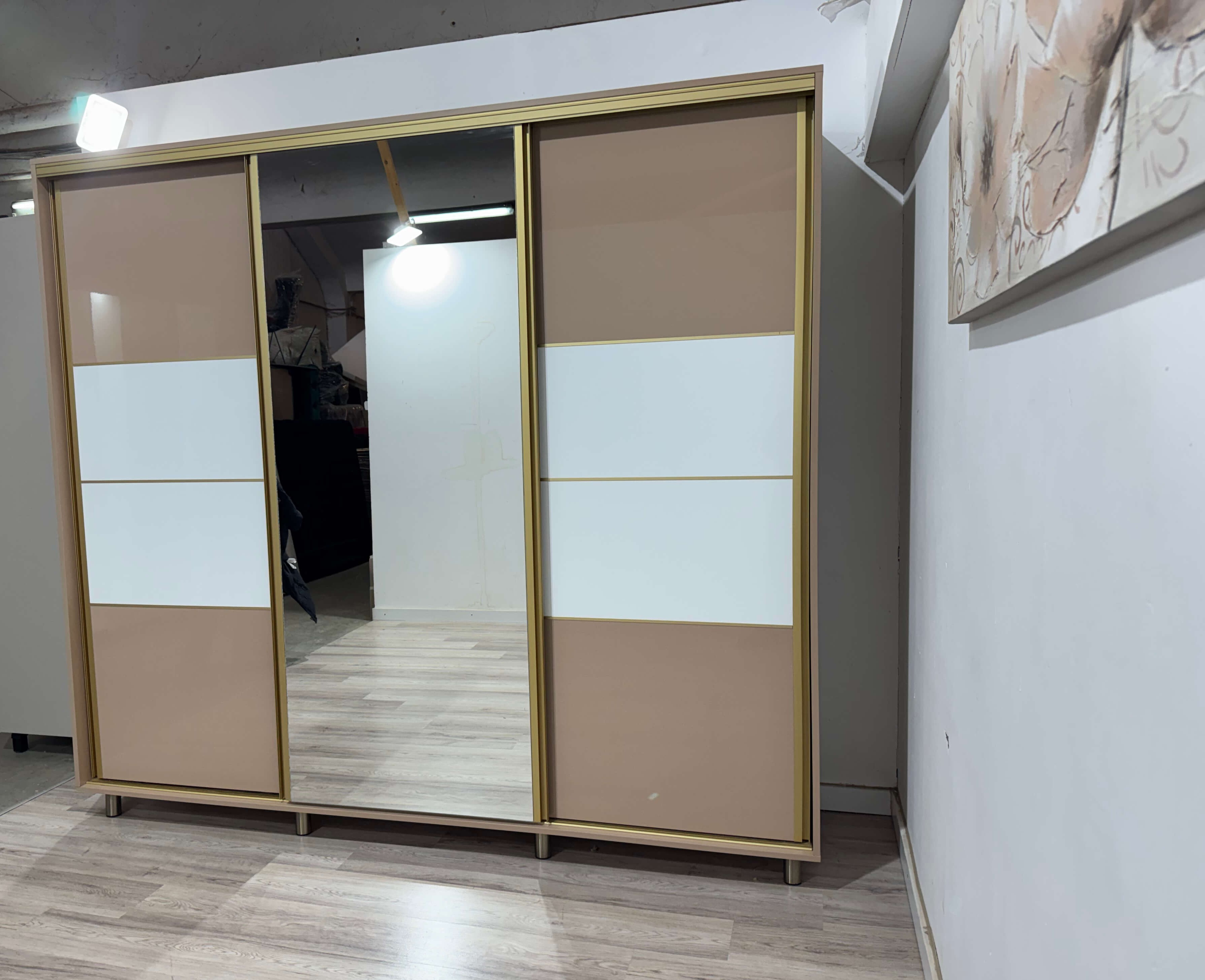 Dressingul cu dimensiuni de 220 înălțime, 240 lățime și 60 cm adâncime oferă spațiu amplu pentru organizare. 2 uși din MDF lucios și 1 ușă cu oglindă, accesorii și picioare aurii, creează un efect modern și luminos, iar interiorul este compartimentat eficient cu bare pentru umerașe și polițe, pentru haine, cutii sau accesorii.