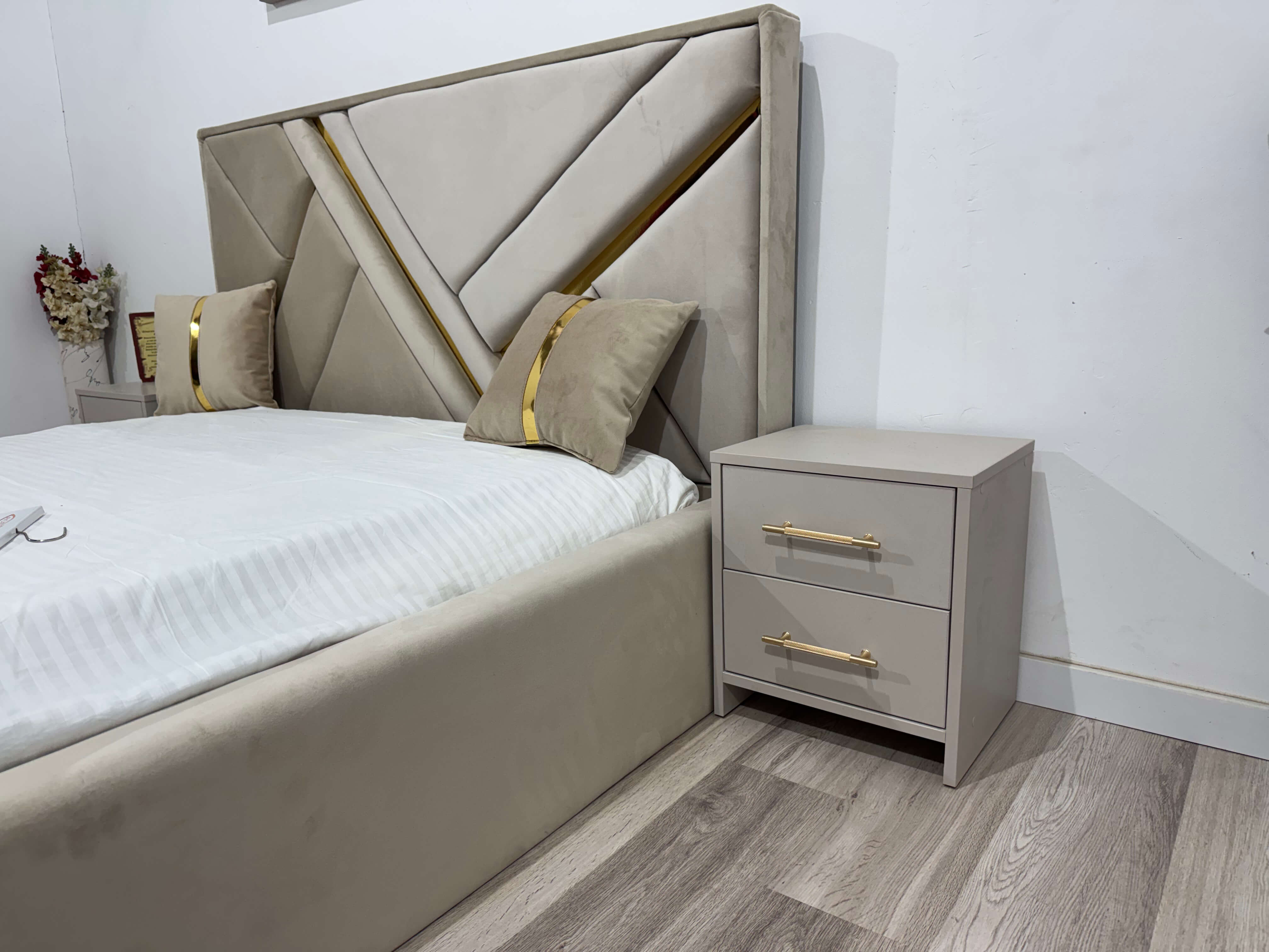 Patul tapițat din catifea premium impresionează prin tăblia cu design geometric și inserții aurii moderne, devenind punctul central al camerei. Este prevăzut cu somieră metalică rabatabilă și ladă de depozitare generoasă, ideală pentru lenjerii, pături sau perne. Structura solidă din lemn și PAL asigură rezistență în timp.