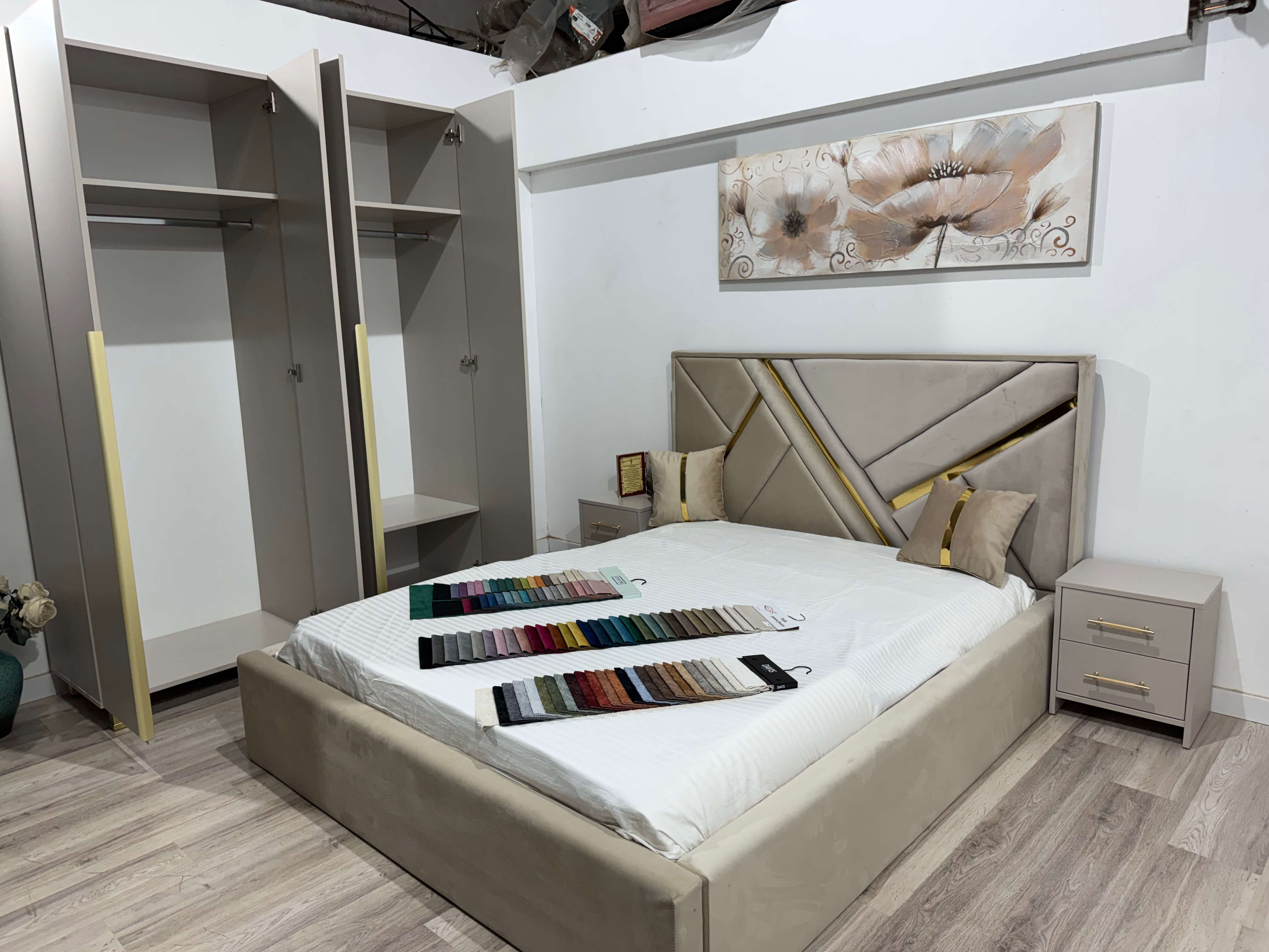 Dormitor matrimonial complet cu pat tapițat catifea și ladă depozitare, dressing 4 uși – model ZEN
