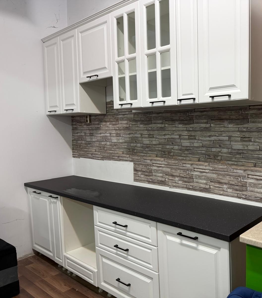 Configurația include spațiu pentru cuptor, spațiu pentru hotă, sertare practice, corpuri inferioare solide și dulapuri suspendate spațioase, astfel încât să ai totul organizat și la îndemână.